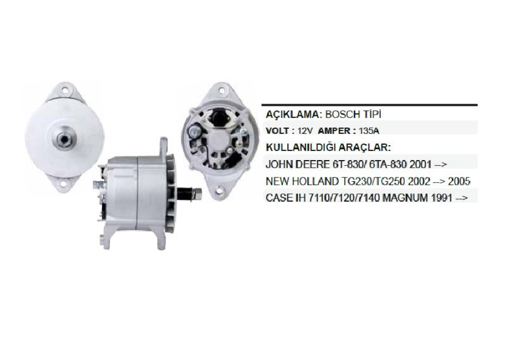 ALTER. 12V 135A BOSCH TİPİ NEW HOLLAND TG 210 - 230 BICERDÖVER/JOHN DEERE CASE-IH/CUMMINS REMA-ALT294