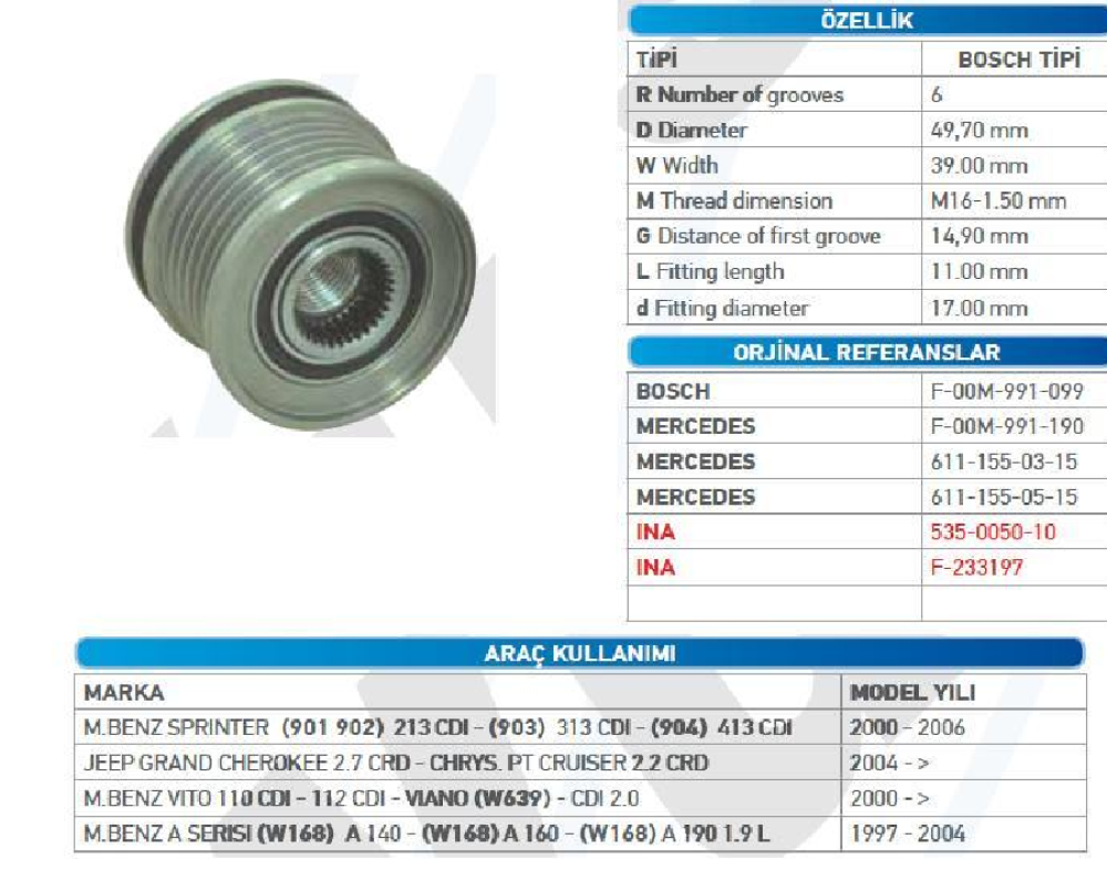 ALTER.KASNAK BİLYALI 6 KANAL BOSCH TİPİ >VW CADDY SPRINTER 313CDİ 00>06/CHEROKEE 2,7CRD 04> VITO 110-112CDI 120A-150A KSN91265 6111550715 F233197.5 6111550715 6111550515 F233197.5 535005010 WUT.1102.0050
