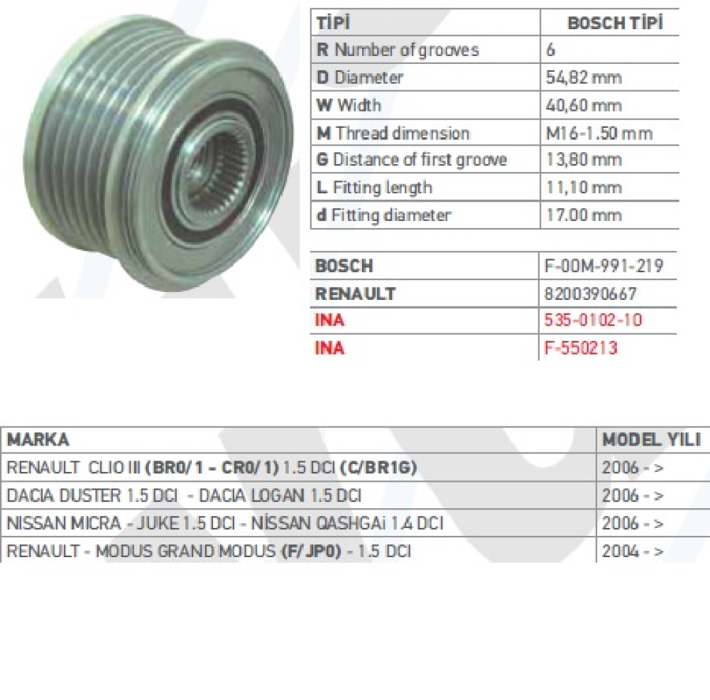ALTER.KASNAK BİLYALI > CLIO III-KANGOO-*MEGANE II CLİO III 1,5DCİ-DACIA DUSTER LOGAN-NISSAN MİCRA JUKE 1.5 DCI * 1.4/1.6 16V. 6 KANALLI ŞARJ UÇ 58,25X40, 535010210 BOSCH - - 535010210 KSN91296 WUT.1102.0087