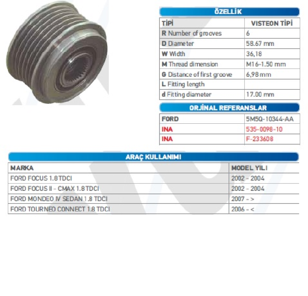 ALTER.KASNAK BİLYALI FORD TRANSİT CONNECT -MONDEO -SMAX-GALAXY-FOCUS 1.8 TDCİ WİSTEON DİNAMOLARIN MOTOCRAFT F 233608.1 535009810 FORD FORD 5M5Q-10344-AA F233608.03 535009810 KSN2483 WUT.1102.0025