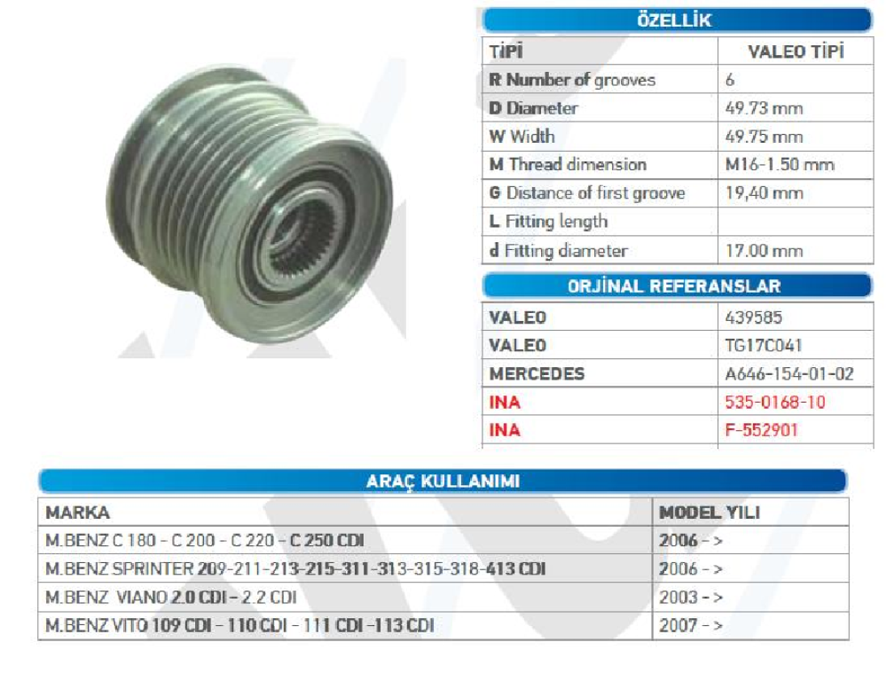 ALTER.KASNAK BİLYALI > MERCEDES BENZ C180-200-220-250-SPRINTER 120A-150A VALEO DİN. 6 W KSN94273 WUT.1102.0061