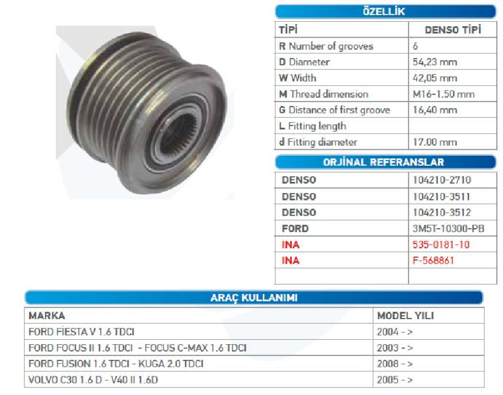 ALTER. KASNAK BİLYALI NIPPON DENSO TİPİ FORD FOCUS FIESTA CMAX -KUGA1.6-2.0 TDCİ 2.0 1.6 DOBLO KSN82115 WUT.1102.0027