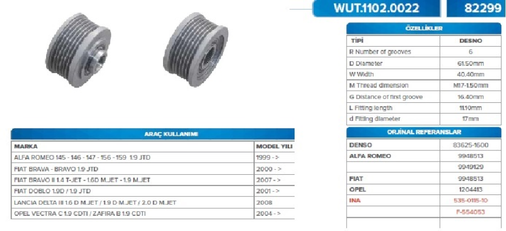 ALTER. KASNAK RULMANLI > ALFA ROMEO-145,156,CADILLAC-BLS FIAT-BRAVO,DOBLO,CROME,IDEA,GRAND PUNTO,STİLO,SEDİCİ,MAREA,MULTIPLE LANCIA-DELTA,LYBRA OPEL-VECTRA,ZAFİRA,SIGNUM SAAB-9-3,9-5 SUZUKI VAUXHALL 535011510 F-554053 ALFA ROMEO-994 8513 ALFA ROMEO-994 WUT.1102.0022 KSN82299 WUT.1102.0022
