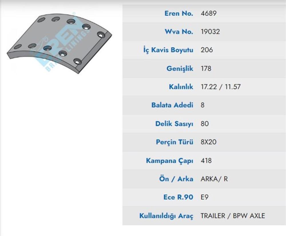 DORSE / BPW - SAF DINGIL FREN BALATASI PABUC PILOT 18CM (FULL ORGANİK) 4689
