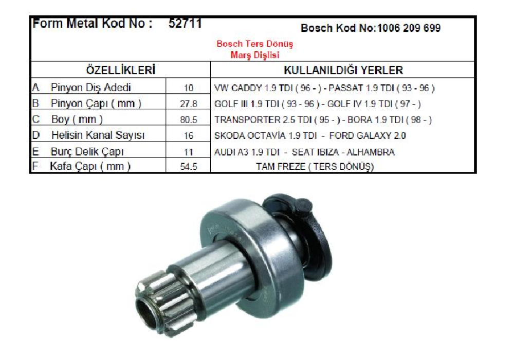 MARŞ DİŞLİSİ 10D>BOSCH TİPİ CCW TERS DÖNÜŞ 16 VW CADDY-GOLF-PASSAT/OCTAVIA 1.9/FORD GALAXY/AUDI A3/ SEAT IBIZA VW TRANSPORTER 2,5 TDI-2.4 (KALIN GÖVDE 54,5mm) 52711