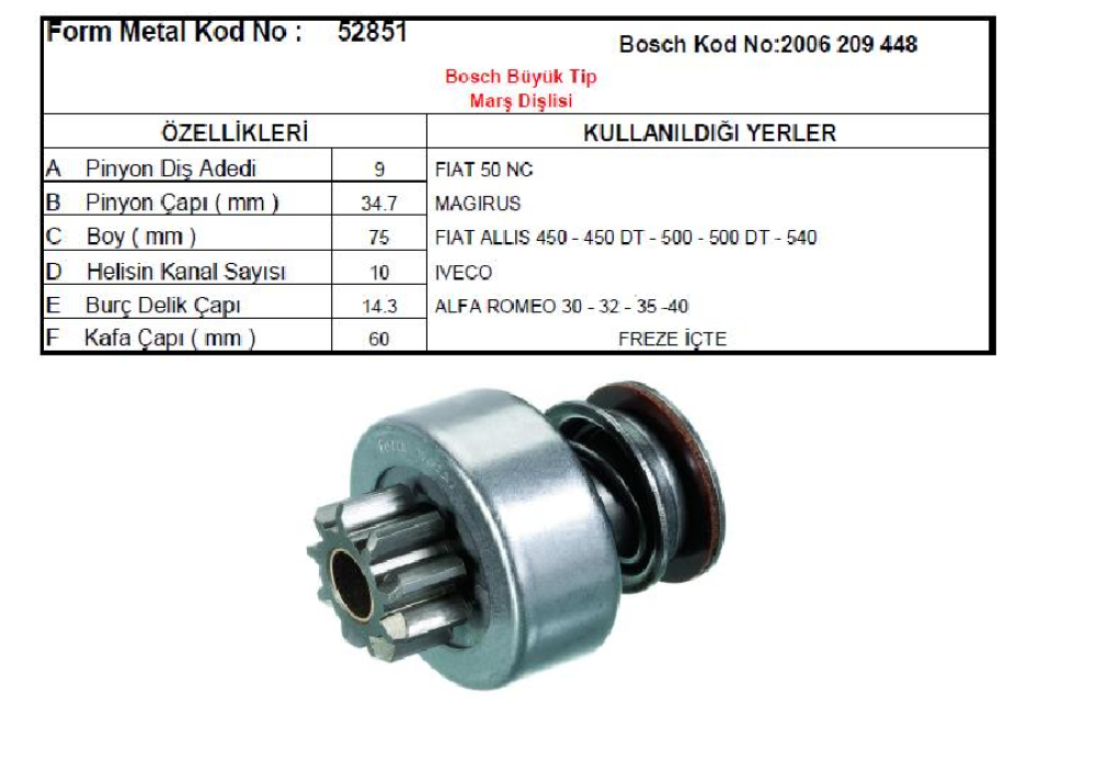 MARŞ DİŞLİSİ 9D-KISA>BOSCH TİPİ ALFA ROMEO MAGIRUS MİNİBÜS/ATLAS COPCO/FIAT 50NC-540 52851