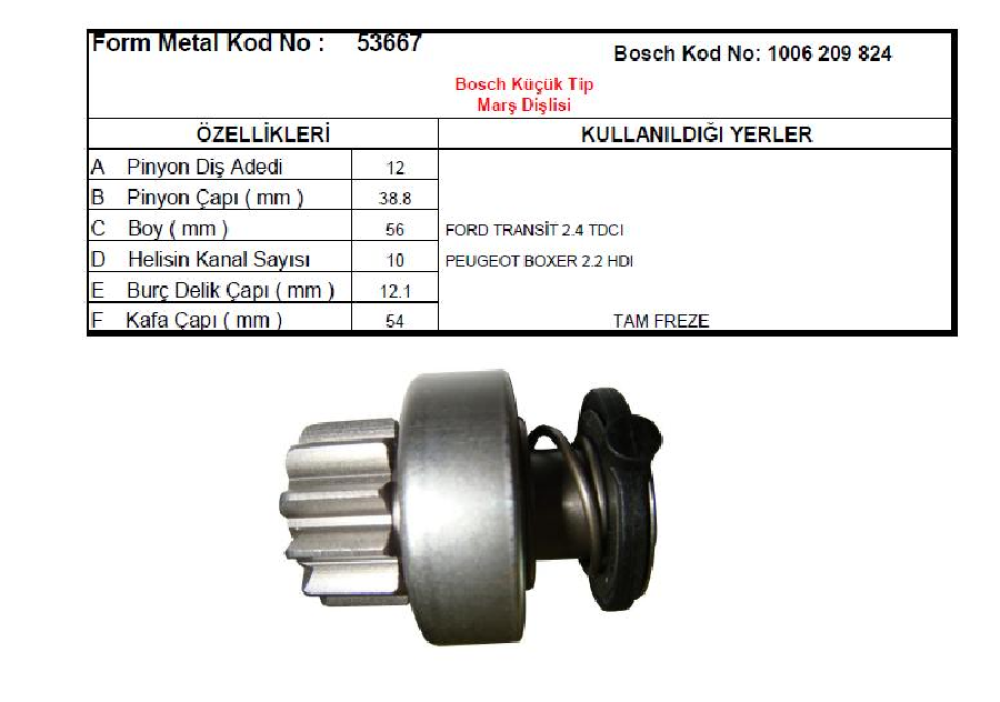 MARŞ DİŞLİSİ BOSCH TIPI 12 DIS FORD TRANSIT V347 2.4TDCI/CITROEN JUMPER 2.2HDI(100/120) PEUGEOT BOXER2.2HDI(100/120) /FIAT DUCATO 2.2D M.JET (06->) (1642) 53667