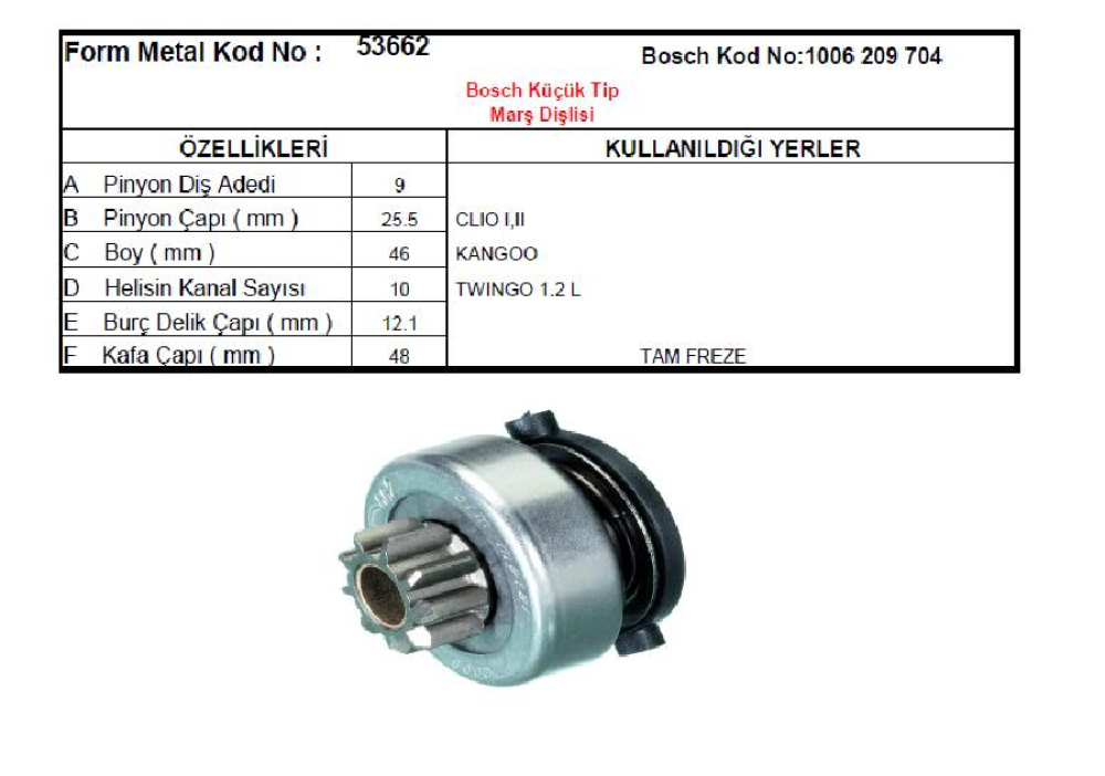 MARŞ DİŞLİSİ BOSCH TIPI 9 DIS 1006209704 RENAULT CLIO I-II / KANGOO / TWINGO 1.2 (1153) 53662