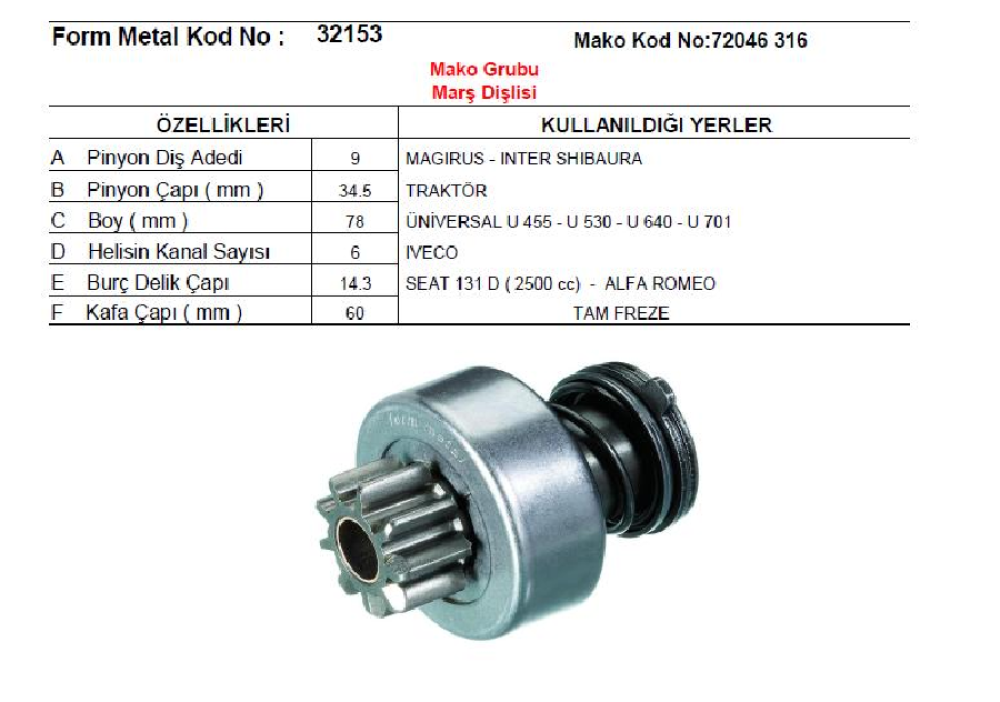 MARŞ DİŞLİSİ ÇATALSIZ 9D-6K-DF>MAGIRUS MİNİBÜS/INTER TRAKTÖRK SHİBAURA ÜNİVERSAL TİP YM U455 U530 U640 U701 İVECO SEAT 131D (2500cc) ALFA ROMEO MAKO-72315667