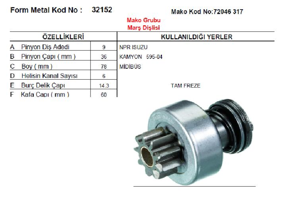 MARŞ DİŞLİSİ ÇATALSIZ MAKO TİP 9D-6K-DF>ISUZU YM NPR KAMYON MİDİBÜS BOY:78 MM PİNYON ÇAPI 36 MM 32152