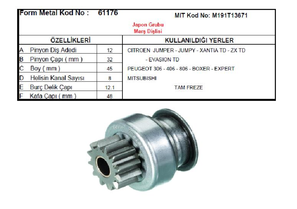 MARŞ DİŞLİSİ MITSUBISHI TIPI 12 DIS 1.01.806 RENAU LT CLIO III 1.5 DCİ KANGOO 1.5 DCİ DACIA LOGAN 1.5 DCİ NISSAN QASHQAI-NOTE 1.5 DCİ CİTROEN JUMPER JUMPY XANTİA TD ZX EVASİON TD PEUGEOT 306 - 406 - 806 BOXER EXPERT 61176