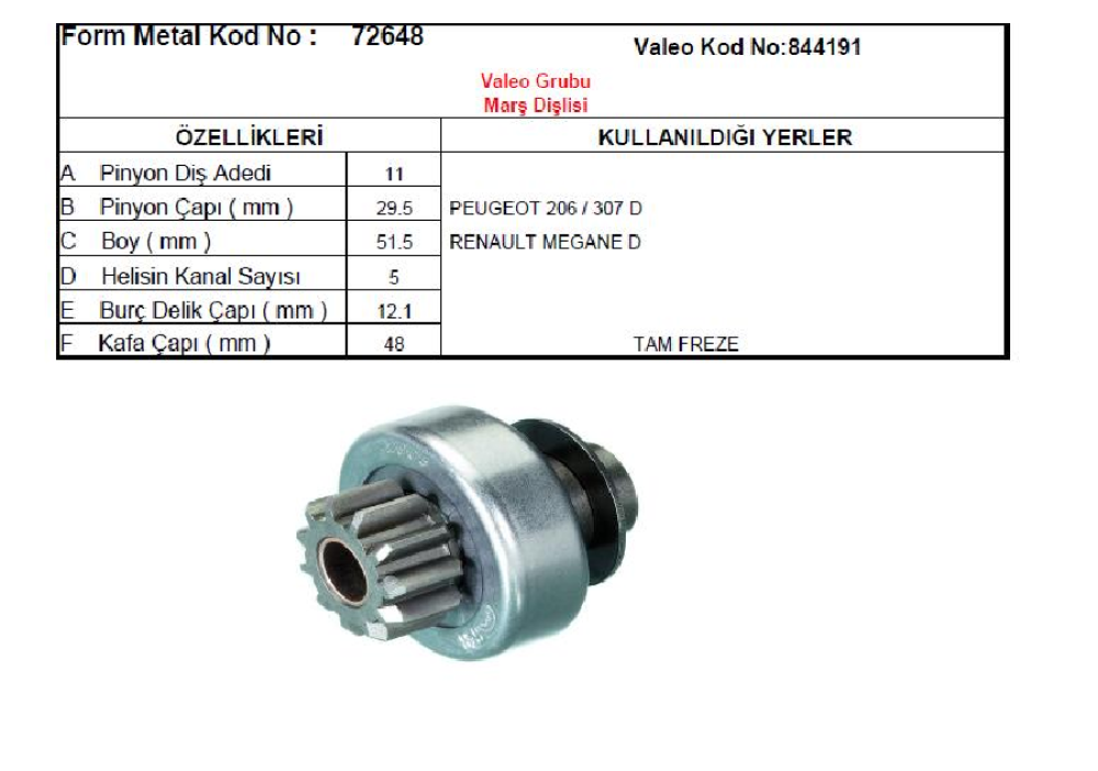 MARŞ DİŞLİSİ VALEO TİP 11D PİNYON ÇAP:29mm BOY:51mm KANAL SAYISI:10 BURÇ DELİK ÇAP:12mm KAFA ÇAP:47mm> RENAULT MEGANE DİZEL /PEUGEOT 206-307 1.4 HDI-CITROEN 1.4 HDI 72648