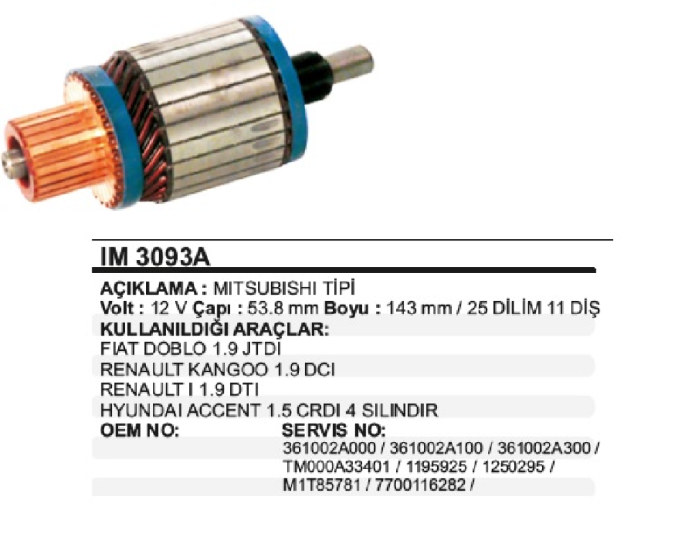 MARŞ KOLL. 12 V FİAT DOBLO 1.9 JTDİ RENAULT KANGOO 1.9 DCİ RENAULT 1.9 DTI 25 DİLİM 11 DİŞ ÇAP:53,8mm UZUN.143mm REMA-IM3093A