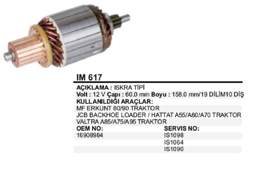 MARŞ KOLL. 12V.10D. 19 DILIM ISKRA TİPİ MF ERKUNT 80-90 TRAKTÖR/JCB BACKHOE LOADER/HATTAT A55-A60-A70 /VALTRA A85-A75-A95 16.908.984 REMA-IM617