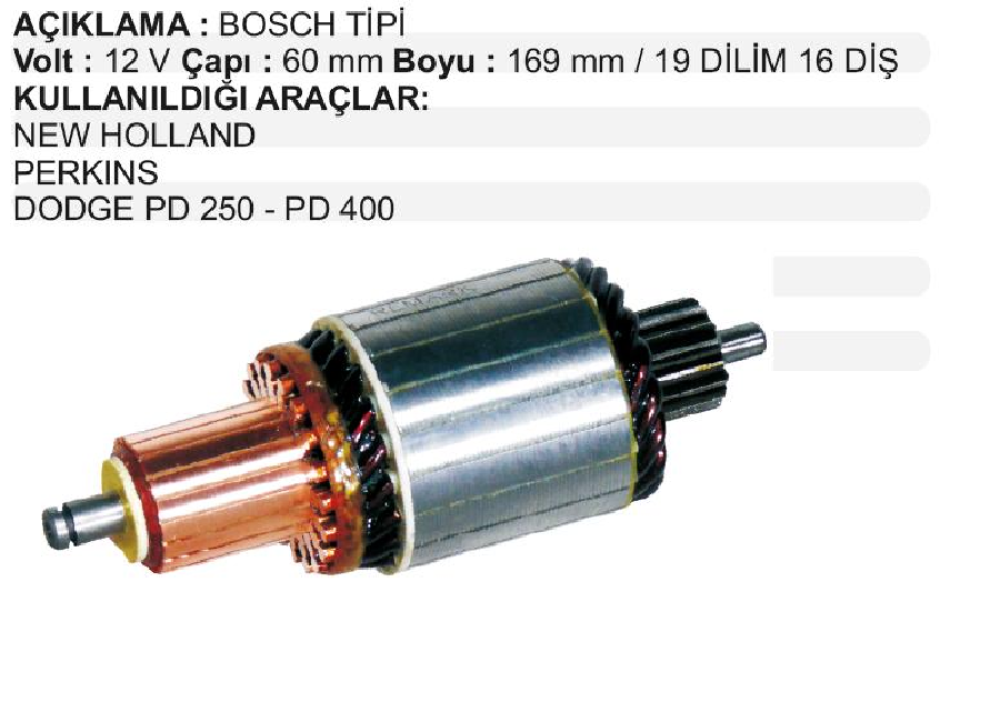 MARŞ KOLL. 12V BOSCH TİP DEUTZ MOTORLU M.FERGUSON NEW HOLLAND PERKİNS DODGE PD250 PD 400 19 DİLİM 16 DİŞ ÇAP 60 mm UZUNLUK 169 mm REMA-IM2139