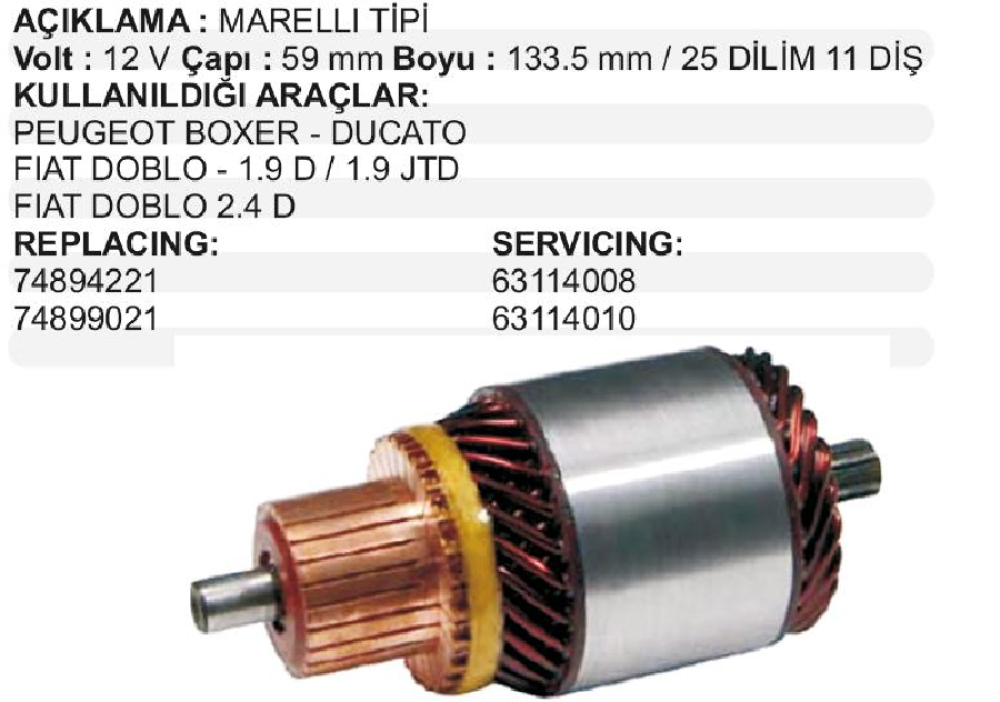 MARŞ KOLL. M. MARELLI TIPI 12V IM 2000 74892221 FIAT DUCATO 2.4 D-DOBLO 1.9 D/JTD /PEUGEOT BOXER BOY:133,5 CAP:59 DIS:11 DILIM:25 REMA-IM2000