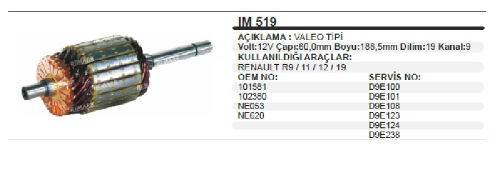 MARŞ KOLL. VALEO TİP 12V.RENAULT 9 - 11 - 12 - 19 19 DİLİM 9 KANAL ÇAP 60 mm UZUNLUK 188,5 mm IM519