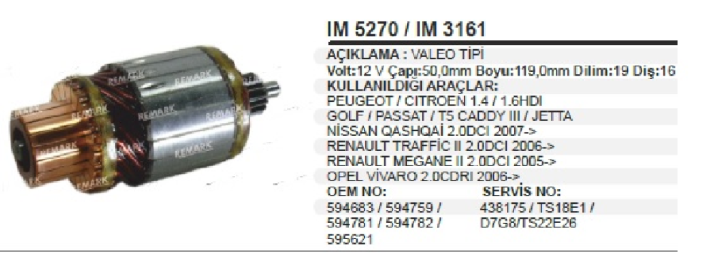 MARŞ KOLL. VALEO TIPI 12V 12V CITROEN BERLINGO, C3, C5, JUMPER, XSARA*RENAULT MASTER YM. (START&STOP IM5270