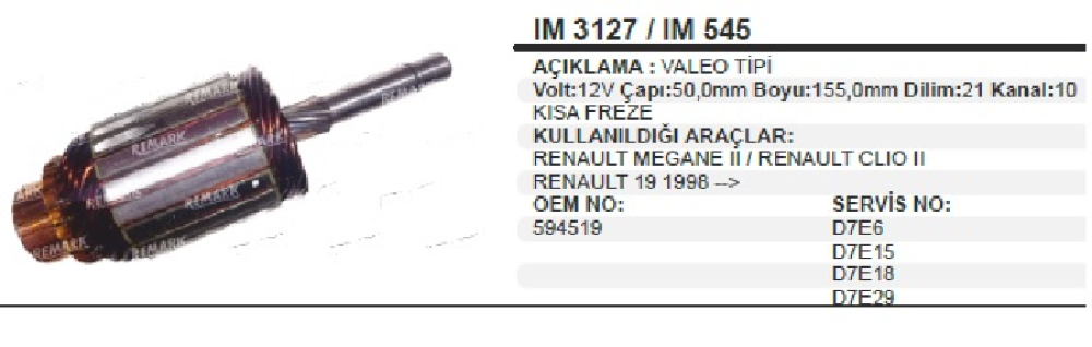 MARŞ KOLL. VALEO TIPI 12V RENAULT MEGANE - CLIO II- R 19 (D7-DUZ) BOY:155/ CAP:50 /DILIM:21 SEKMANLI IM545