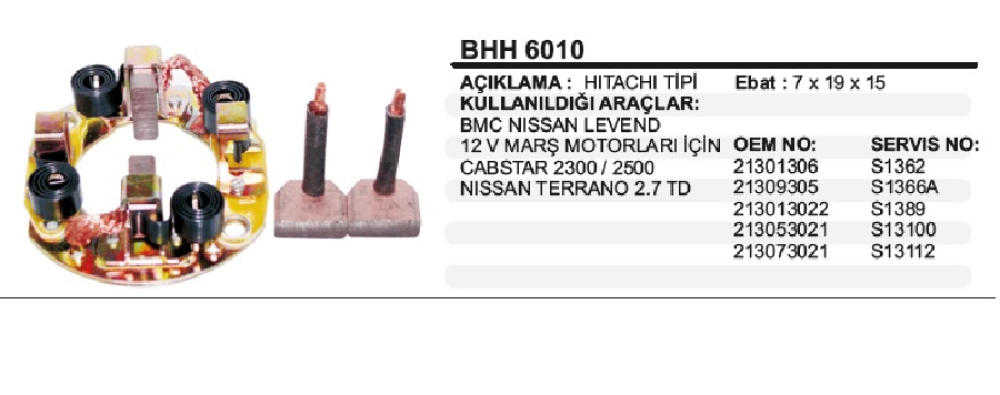 MARŞ KÖMÜR YUV. >HİTACHİ TİPİ 12V CABSTAR 2300, 2500, TERRANO 2.7 TD NİSSAN LEVEND 3000 4KOMURLU PİCK UP 2300-ALMERA-PRİMERA-SUNNY KOMATSU FORKLİFT VERT-BHH6010