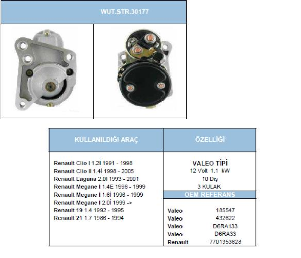 MARŞ MOTORU 12V 1,2KW 10D. VALEO TİPİ RENAULT CLIO 1,2cc - MEGANE 1,6cc - R19 - LAGUNA 2,0cc R9 - WUT.1107.0187 WUT.1107.0187