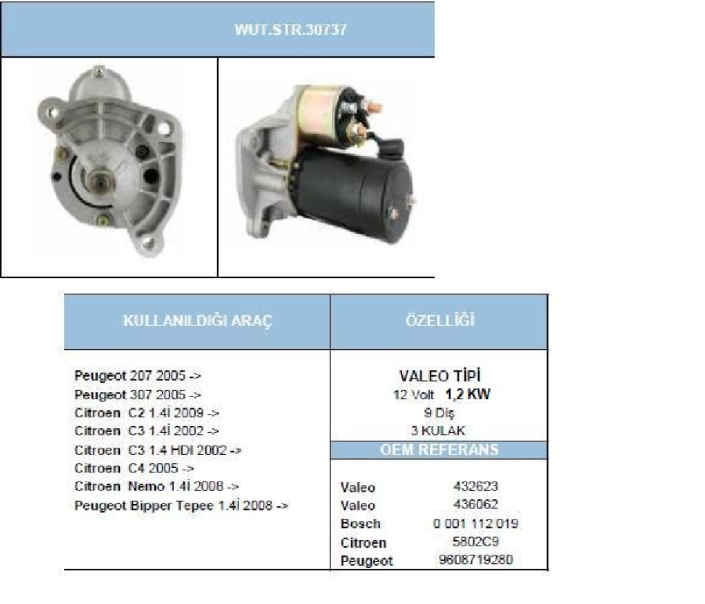 MARŞ MOTORU 12V 1,2KW 9D VALEO TİPİ PEUGEOT106- 206- 207 - 307 - BERLİNGO PARTNER DİZEL CITROEN C3 - SR30737 WUT.1107.0182