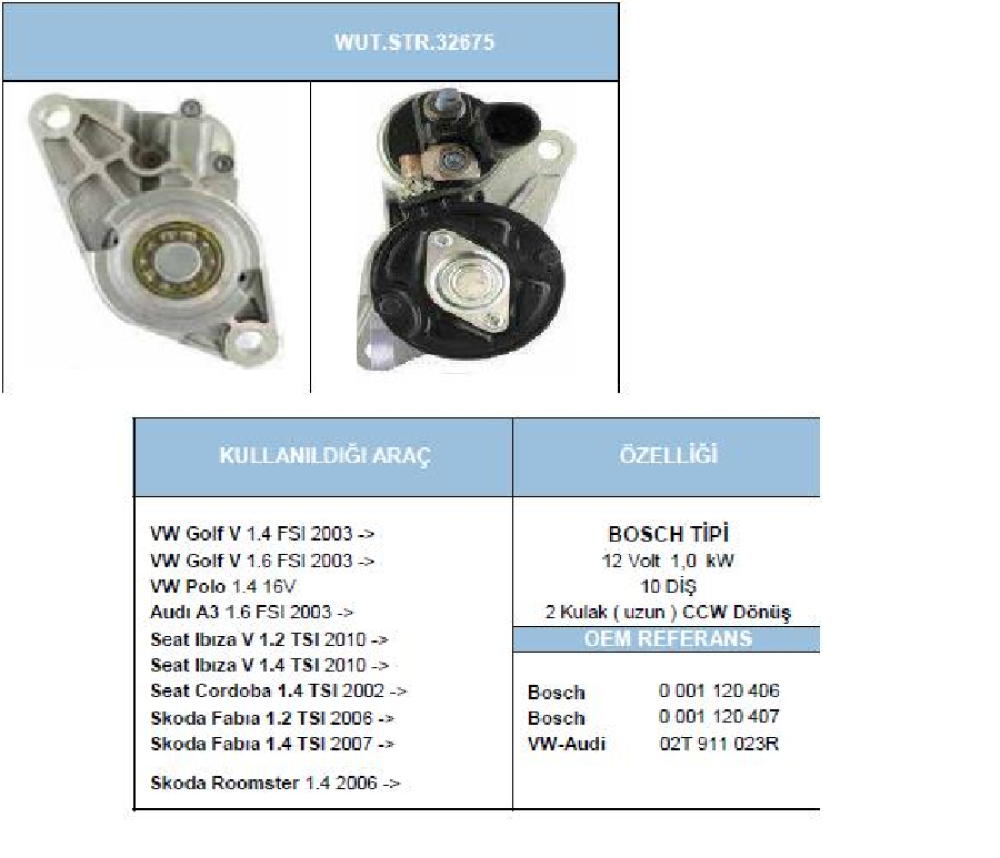MARŞ MOTORU 12V.10D.0,9 KW BOSCH TİPİ SEAT İBİZA/CORDOBA/LEON 1,4 16V/SKODA FABİA/OCT W STR32675 WUT.1107.0275