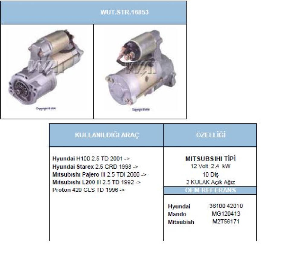 MARŞ MOTORU 12V. 10D. 2.0KW MİT. TİPİ MEGA STAR HYUNDA STAREX/H1/KIA BONGO /PREGGİO 2,5TCI/L200-3 STR16853 WUT.1107.0091