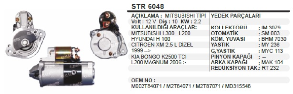 MARŞ MOTORU 12V.10D.2,2 KW MIT.TİPİ L-300/H100/CİTRÖEN XM 2,5L 99-> KİA BONGO K2500 TCİ UZUN BURUN D 600081 STR6048