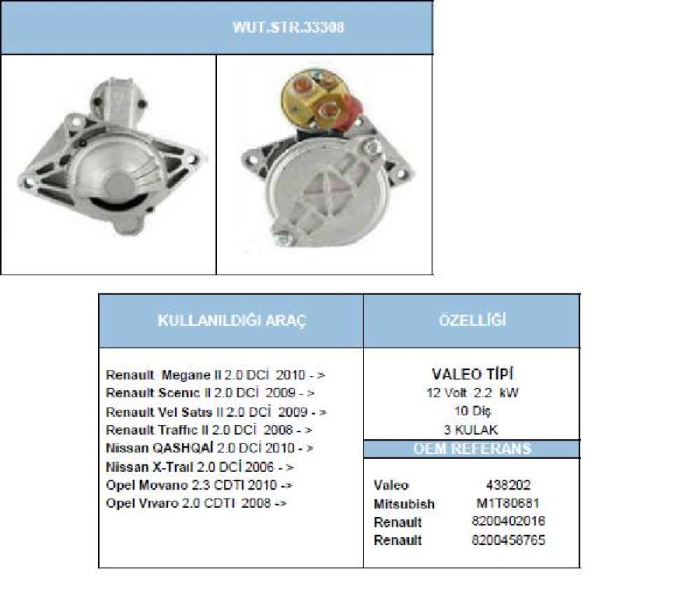 MARŞ MOTORU 12V. 10D. 2,2 KW VALEO TİPİ MASTER III NİSSAN QASHQAİ 2.0 DCİ 2007--> /RENAULT TRAFFİC II 2.0 DCİ /MEGANE II 2.0 DCİ /MEGANE III 2.0 DCİ2009-->KOLEOS 2.0 DCİ 2008-->/OPEL VİVARO 2.0 CDTİ 2006-->/MOVANO 2.3 CDTİ 2010--> STR33308 WUT.1107.0204