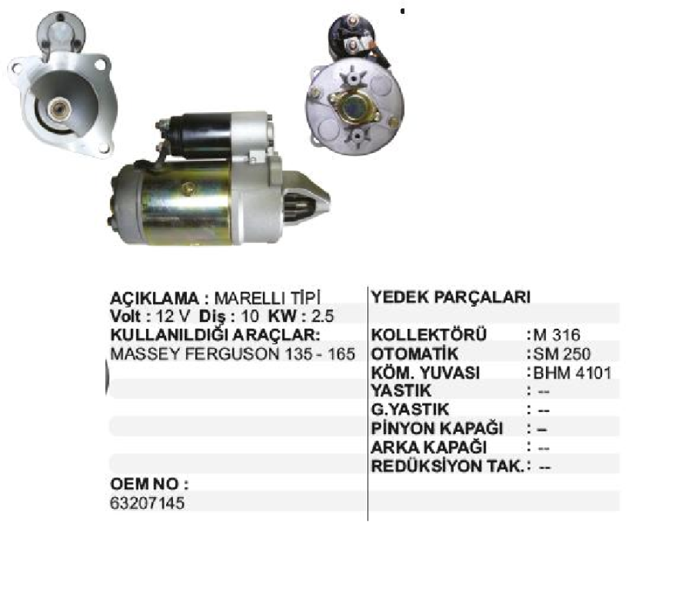 MARŞ MOTORU 12V,10D,25 KW MARELLİ TİPİ MF,135 148 165 240 UZEL TRAKTOR SAG AGIZ MAKO-63207145
