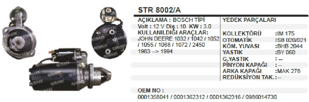 MARŞ MOTORU 12V.10D.3,0 KW BOSCH TİPİ.JOHN DEERE 1032, 1042, 1052, 1055, 1068, 1072, 2450 1983-1994/ STR8002A