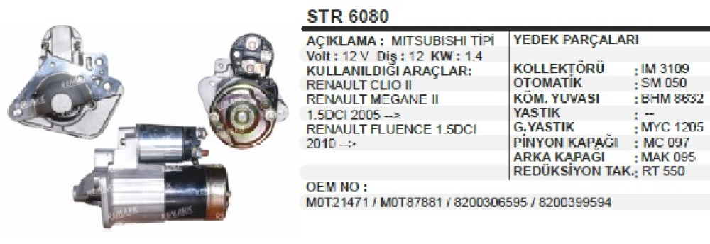 MARŞ MOTORU 12V. 12D. 1.4 KW MİTS. TİPİ DACIA LOGAN-SANDERO 1,5DCİ, RENAULT CLIO III 1,5DCİ - KANGO STR6080
