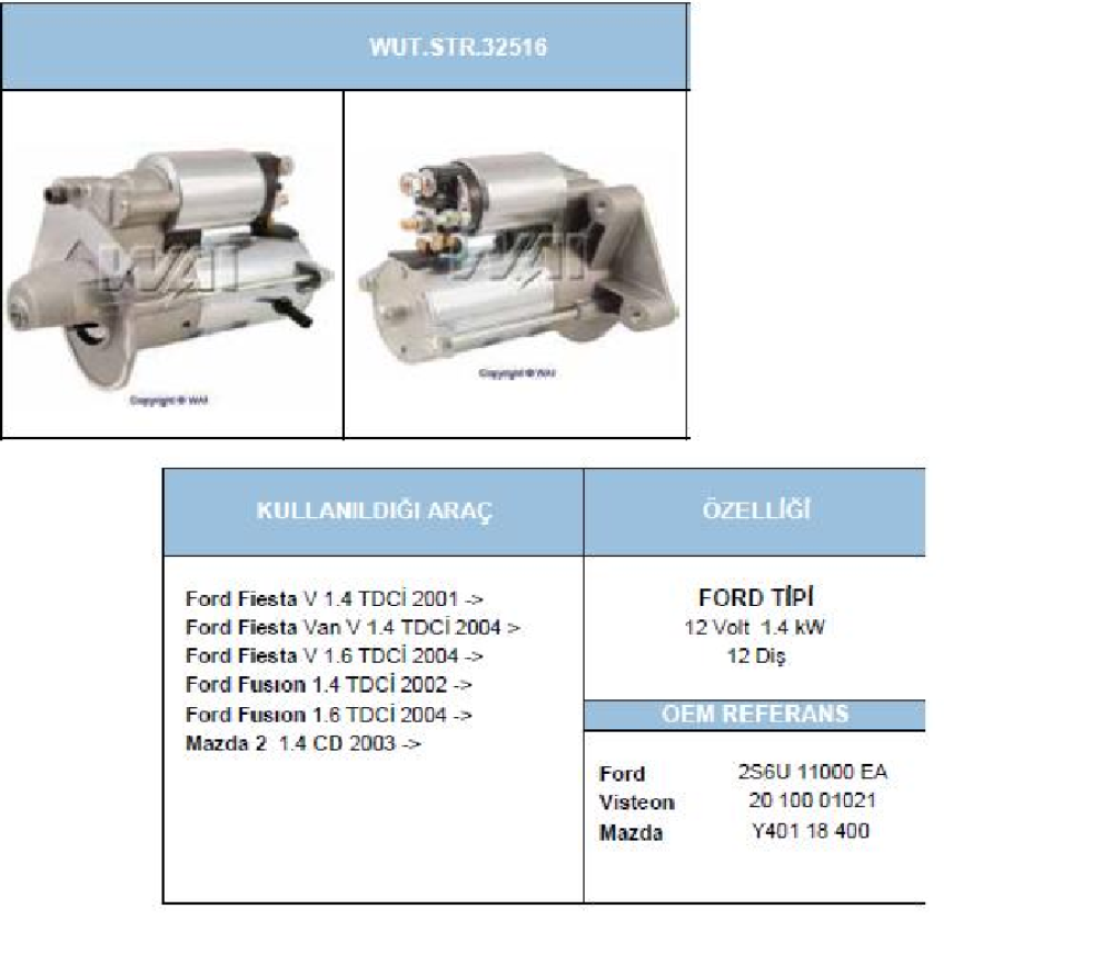 MARŞ MOTORU 12V. 12D. 1.4 KW VİSTEON TİPİ FORD FİESTA V 1.4 TDCİ 2001-->/FİESTA V 1.6 TDCİ 2004--> /FİESTA VI 1.4 TDCİ 2008--> /FUSİON 1.4 TDCİ 2002-->MAZDA2 1.4 TD 2008-->/F6JA/F6JB/KVJA/HHJ MOTORLU / STR32516 WUT.1107.0071