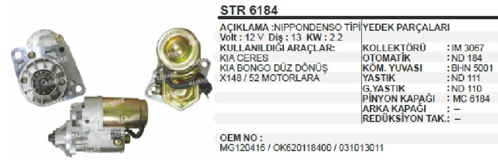 MARŞ MOTORU 12V.13D.2,2 KW DENSO TİPİ MAZDA 2200 DİZEL KIA BONGO-CEREZ YM DÜZ DÖNÜŞ STR6184