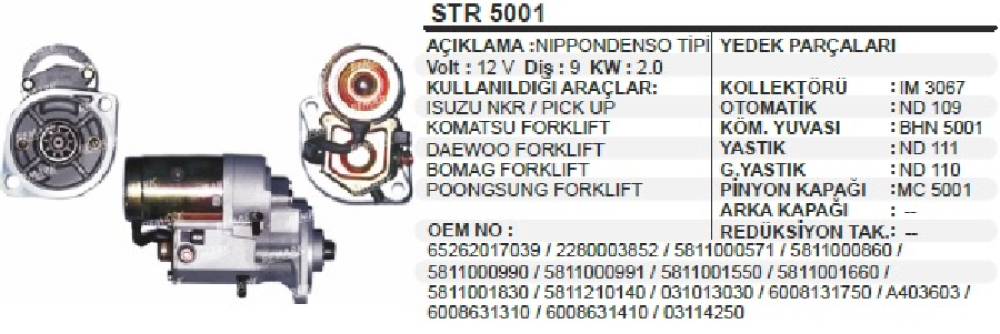 MARŞ MOTORU 12V 2.0KW 9D DENSO TİPİ KOMATSU FORKLİFT HYSTER LİFT /CHEVROLET GMC /TERMOKİNG/ İSUZU P STR5001