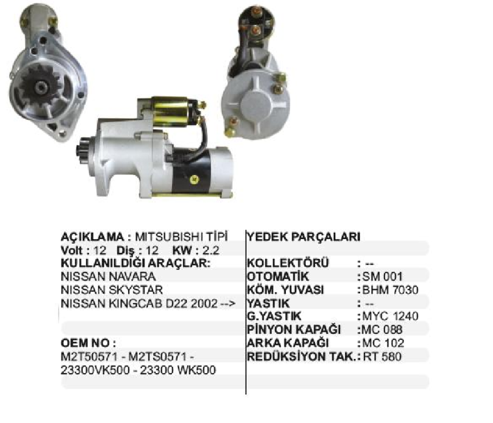 MARŞ MOTORU 12V 2,2KW 12D MİT.TİPİ NiSSAN PICK-UP (D22) 2.5D-(D222) 3.0TD /SKYSTAR 2.5Dİ/(D22) 2.5Dİ REMA-STR6020