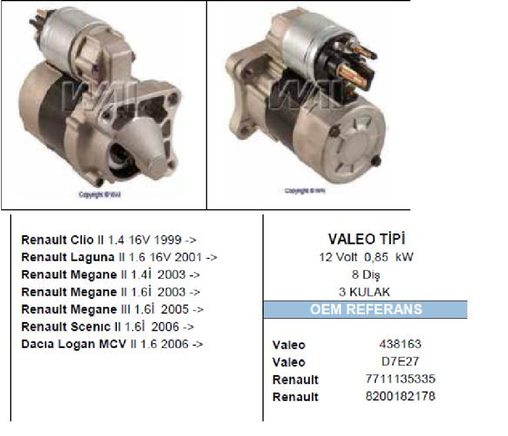 MARŞ MOTORU 12V.8D.0,8 KW VALEO TİPİ >RENAULT MEGANE II 1.6 16V 2003->/CLIO III 1.6 16V 2006-> STR32566 WUT.1107.0193