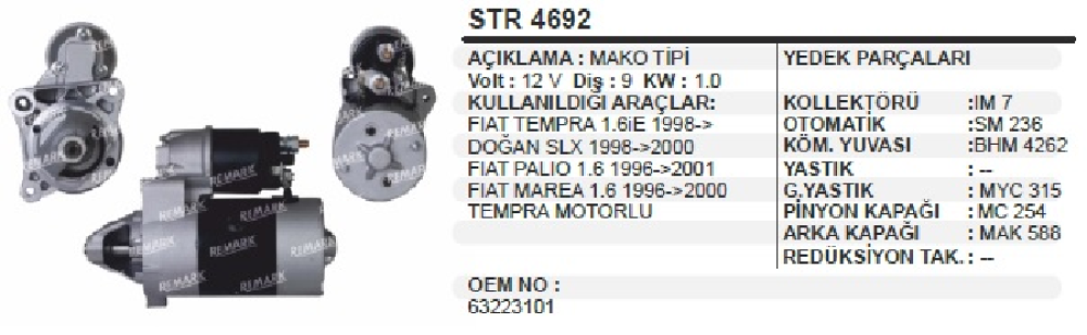 MARŞ MOTORU 12V. 9D. 1.0 KW MAKO TİPİ FİAT TEMPRA 1.6İE 1998--> /DOĞAN SLX 1998-->2000 /PALİO 1.6 19 STR4692