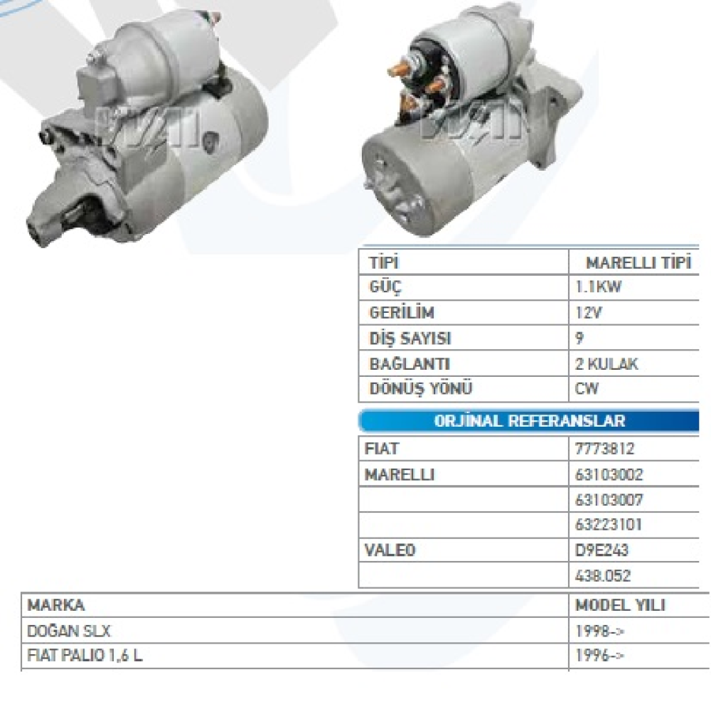 MARŞ MOTORU 12V. 9D. 1.0 KW MAKO TİPİ FİAT TEMPRA 1.6İE 1998--> /DOĞAN SLX 1998-->2000 /PALİO 1.6 19 STR31146 (STR4692) WUT.1107.0062