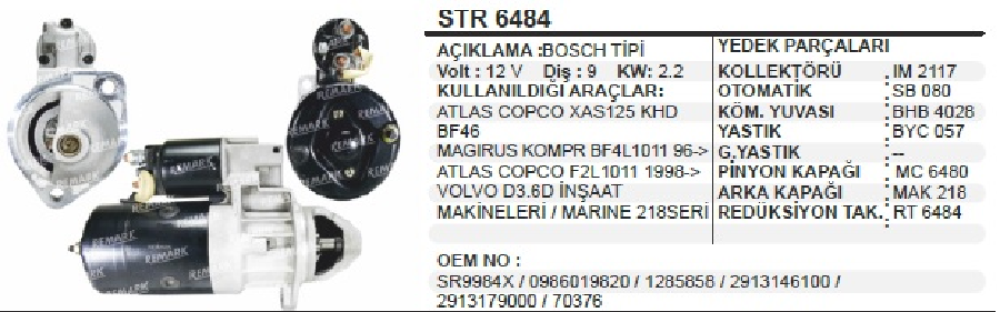 MARŞ MOTORU 12V. 9D. 2.2 KW BOSCH TİPİ ATLAS COPCO XAS 125 KHD BF46/ F2L1011 /MAGİRUS KOMPRESOR BF4L STR6484
