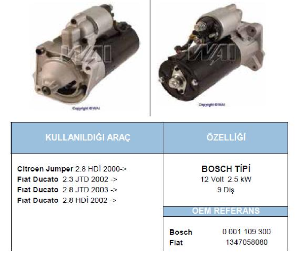 MARŞ MOTORU 12V.9D.2,5 KW BOSCH TIP DUCATO/JUMPER/BOXER 2,3-2,8 JTD 2002-> WUT.1107.0059 WUT.1107.0059