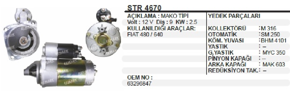 MARŞ MOTORU 12V.9D.2,5 KW>MAKO TİPİ FIAT TRAKTÖR 480-640 YM DEUTZ MOT. CHRYSLER PD 250 DODGE /FARG STR4670