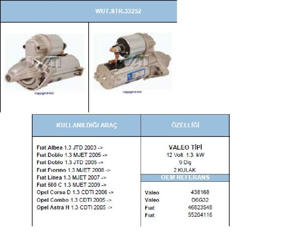 MARŞ MOTORU 12V VALEO TİP 1,3KW 9D FIAT EGEA ALBEA 1,3M.JET - DOBLO 1,3 MULTİ JET WUT.1107 STR33252 WUT.1107.0052