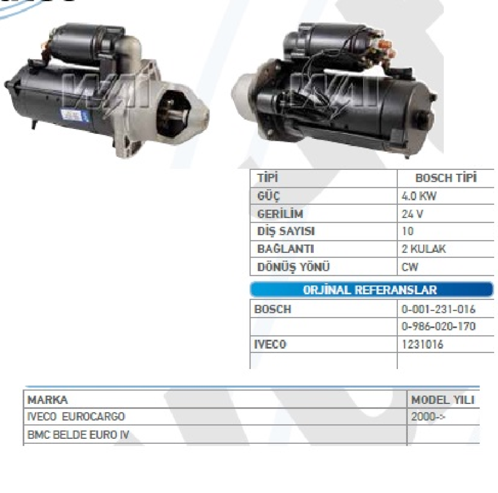 MARŞ MOTORU 24V. 10D. 4.0 KW BOSCH TİPİ BMC MİDİLUX /PROFESYONEL/ İVECO M175-17 /100E 17K /TECTOR 20 STR30123 WUT.1107.0439