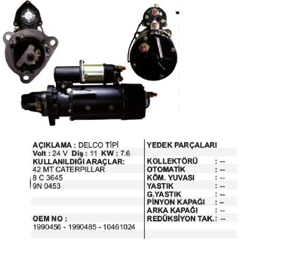 MARŞ MOTORU 24V 42MT 11D 7.6KW DELCO TİPİ CATERPILLAR 8C3645-9N0453/CASE EXCAVATOR 40D980/CLARK/CHAMPİON/FİAT ALLİS/CUMMİNS MARİNE (DİŞLİ SD1146 ÇAPI 56.5mm) STR50-151 REMA-50151