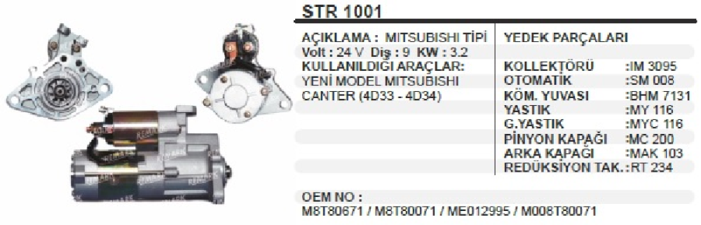 MARŞ MOTORU 24V.9D.3,2 KW MİT.TİPİ YM.MITS.CANTER 859 F659/FUSO FE 507-515-649 PRESTİGE STR1001