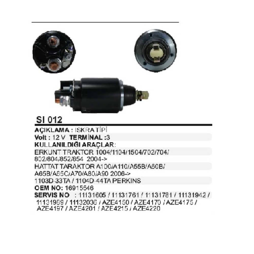 MARŞ OTOM. 12V. ISKRA TİPİ MF/ERKUNT 1004,1104,1504,702,704,802,804,852,854 2004-->/HATTAT TRAKTÖR A100,A110,A55B,A60B,A65B,A65C,A70,A80,A90, 2006-->1103D-33TA,1104D-44TA PERKİNS MOTORLU,JCB/JOHNDEERE/MF HİNDİSTAN. CİVATANIN BİRİ M10 BİRİ 8 REMA-SI012