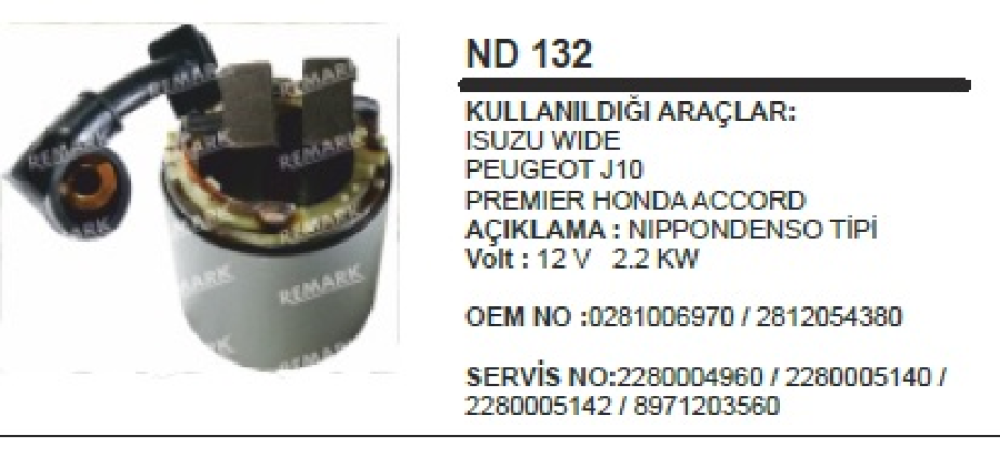 MARŞ YASTIĞI GÖVDELİ >DENSO TİPİ ISUZU WIDE/PEUGEOT J9/ J10 PREMIER 2.2 KW EN:67,5mm BOY:78mm ND132