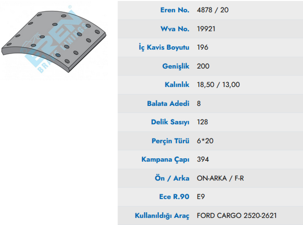 ON - ARKA - ILAVE DINGIL FREN BALATASI (PABUC) 20CM + 1 EN (FULL ORGANIK) (FARKLI) - FORD CARGO / 2621-2520 INTERCOOLER 4878/20